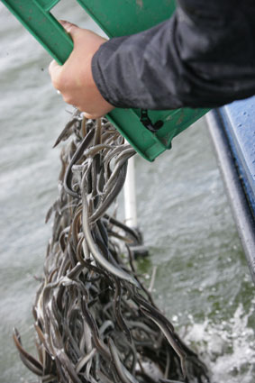 Die hier ausgesetzten Aale sind 2 Jahre alt, sie kommen von der Aalversandstelle des Deutschen Fischereiverbandes in Halstenbek. Der Transport erfolgt mit eigens hierfür ausgerüsteten LKW's. Nach der Ankunft im Maasholmer Hafen wurden die Aale in Bottiche entlassen, um in diesen auf kleinen Fischerbooten schließlich auf See ausgebracht zu werden.
