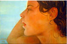 Das Werk: "Kinderportrait" 60 x 40 cm, Öl auf Leinwand, Fotorealismus. Inspiriert durch ein Foto ihrer achtjährigen Enkelin Kenza, aufgenommen an einem Strand in Griechenland, ist dieses Portrait entstanden.