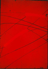 Das Werk: "Geometrie Rot" ist ein klassisches Maksa-Werk. In ihren Werken geht es vielfach um Existenzielles. Das 39x42 cm große Bild (Acryl auf Karton) ist in der für die Gruppe Swoi typischen Kratztechnik auf Kreidekarton gestaltet.