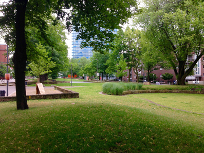 Wo damals die Trasse des Berliner Tors die HAW Hamburg vom Stadtteil St. Georg abschnitt, bietet der Park heute einen vorgelagerten Campus.
