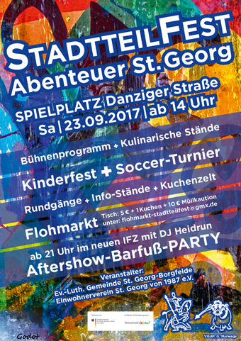 Die Ev.-Luth. Gemeinde St. Georg-Borgfelde und der Einwohnerverein St. Georg von 1987 e.V. laden auch in diesem Jahr zu ihrem beliebten Stadtteilfest ein. Auf dem Spielplatz Danziger Straße, unmittelbar neben und in dem gestern eingeweihten IFZ-Neubau dem Integrations- und Familienzentrum, geht es am Sonnabend bunt zu. Ein großes