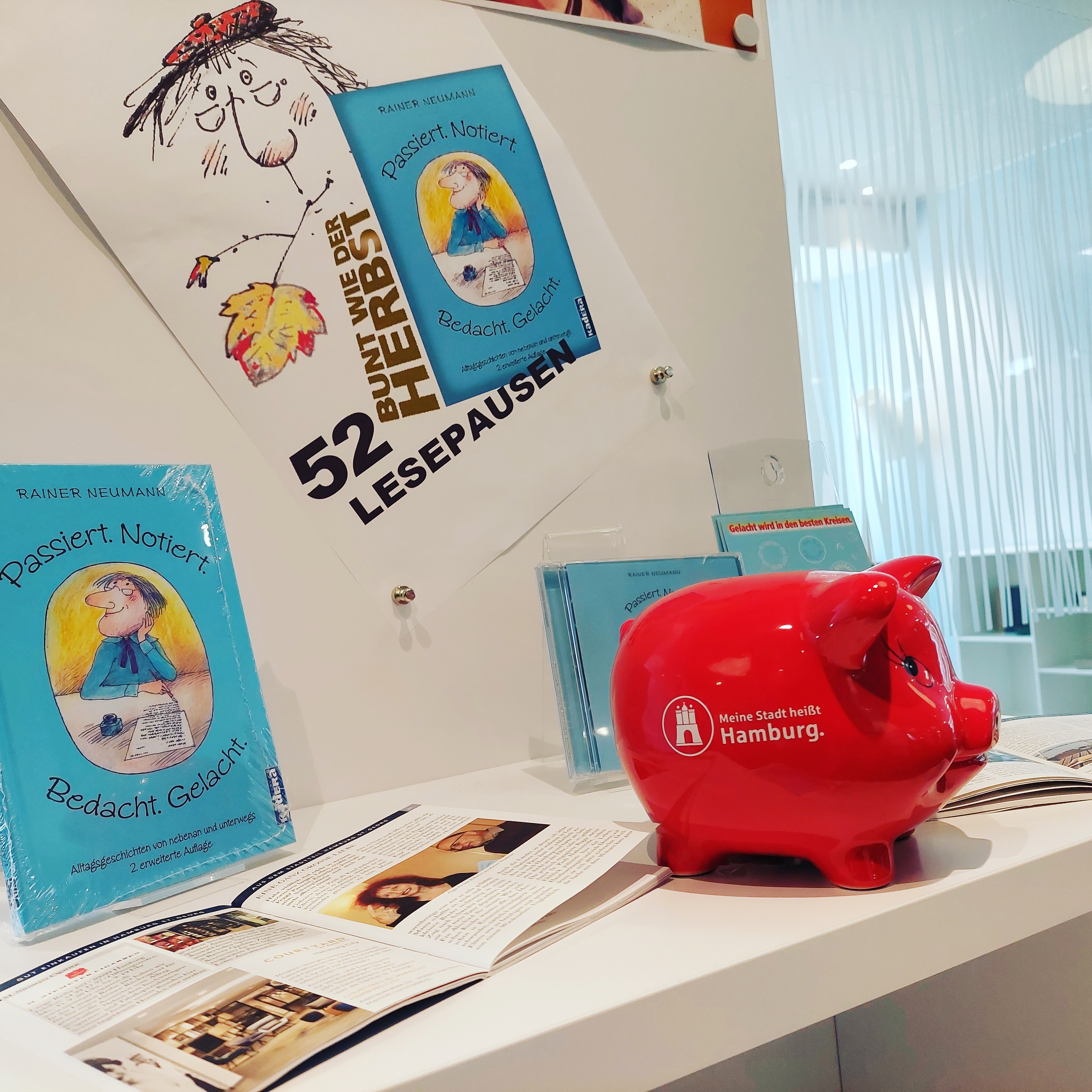 ...jubelte Autor Rainer Neumann, als er aus den Händen von Marlen Schönemann (Haspa) das zu seiner Lesung aufgestellte Haspa-Sparschwein ausgehändigt bekam. Die Freude drückt sich in einer tollen Zahl aus, denn es wanderten 250 Euro in den kugelrunden Bauch des Tieres. Die Zuhörer seiner Lesung, mit Buchverkauf zeigten sich großzügig und steckten einfach etwas MEHR in das Sparschwein, berichtet er. Das liegt sicherlich auch daran, dass sämtliche Einnahmen aus dieser Lesung wieder der Suppengruppe St. Georg zu Gute kommen. Die Suppengruppe engagiert sich in unmittelbarer Nähe zur Haspa in der St. Georgskirche, ehrenamtlich für Bedürftige. Am 8. September 2022 las