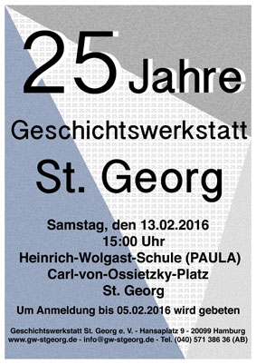 Am kommenden Sonnabend, den 13. Februar, von 15.00 bis 17.30 Uhr feiert die Geschichtswerkstatt St. Georg e.V. in der Heinrich-Wolgast-Schule am Carl-von-Ossietzky-Platz ihr 25jähriges Jubiläum. Die Geschichtswerkstatt mit ihrem Sitz am Hansaplatz befasst sich mit der Entwicklung der sozialen Problematik der Metropole Hamburg und mit der Historie des einstigen Vororts St. Georgii (des heutigen St. Georgs). Sie bietet jedermann die Möglichkeit sich vor Ort in die Geschichte einzulesen, in den