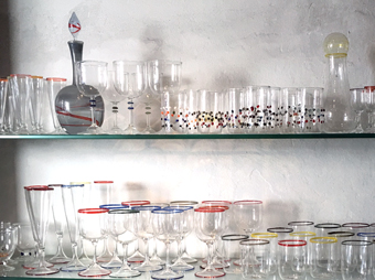 Das "gläserne Reich" von Helmut Wiederhold befindet sich keine fünf Gehminuten vom Hamburger Hauptbahnhof entfernt, einfach die Koppel hinuntergehen. Gleich links am Eingang empfängt den Besucher ein Regal mit vollendeten Glasutensilien zur Inspiration: Große und kleine Gefäße, mit buntem Rand oder schlicht, mit oder ohne verzierende Ornamente und alle für die verschiedensten