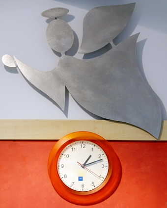 Ein künstlerischer "Gesundheitsengel"schwebt über einer Uhr in der Apotheke.