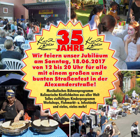 Der Kulturladen lädt am kommenden Sonntag, den 18. Juni 2017 ab 12 Uhr in die Alexanderstraße ein. Seit 35 Jahren stellt das engagierte Kulturladen-Team um Christiane Orhan immer wieder kulturelle Leckerbissen zusammen. Hier wird Programm für die unterschiedlichsten Interessen gemacht, für klein und groß, Musik und bildgebende Kunst, Theater und Tanz, Workshops und Lesungen u.v.m. Außerdem nimmt der Kulturladen aktiv an Veranstaltungen im Stadtteil teil und präsentiert
