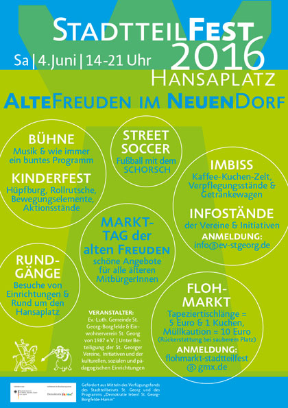 Am kommenden Sonnabend ist es wieder soweit! Von 14 bis 21 Uhr wird der Hansaplatz tüchtig belebt. Die evangelische Kirchengemeinde und der Einwohnerverein St. Georg laden herzlich ein und haben viele Überraschungen für die Besucher vorbereitet: