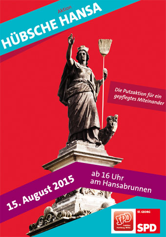 Die SPD St. Georg wird am kommenden Sonnabend gemeinsam mit der SPD Bezirksfraktion Hamburg-Mitte um 16 Uhr den Hansabrunnen auf dem Hansaplatz putzen. Das "Forum Hansaplatz" hat sich in etlichen Sitzungen mit der aktuellen Situation auf und um den Hansaplatz beschäftigt. Entstanden sind Ideen, die nun umgesetzt werden sollen. Unter dem Aktionsmotto "Hübsche Hansa" wird die SPD den 1887 erbauten Brunnen mit der über den Platz thronenden Hansa-Statue putzen. Ausdrücklich geht es der SPD nicht darum Menschen zu vertreiben, um sinnbildlich für Ordnung und Sauberkeit zu stehen, sondern um im Herzen des Stadtteils ein Zeichen für ein gepflegtes