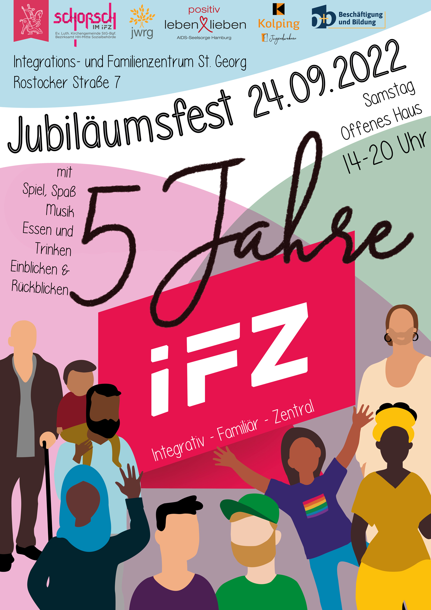 Das Integrations- und Familienzentrum (IFZ) St. Georg feiert sein 5-jähriges Bestehen. Der offizielle Auftakt findet am Freitag, 23. September von 11:00-13:00 Uhr mit Gästen aus der Politik und mit vielen befreundeteren Partnerorganisationen, Freunden und Unterstützern statt. Das Jubiläumsfest für die interessierte Öffentlichkeit startet am Samstag, 24.09. um 14:00 Uhr und endet gegen 20:00 Uhr. Es geht darum die lebendige Vielfalt des Ortes kennenzulernen. Ob bei vielen Informations- und Spielangeboten, im Gespräch oder als Zuschauer am Grill oder am Kuchenbuffet. Im IFZ