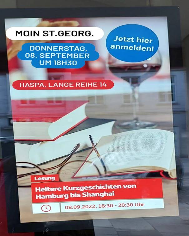 Heitere Kurzgeschichten von St. Georg bis Shanghai liest Rainer Neumann aus seinem Werk: Passiert. Notiert. Bedacht. Gelacht. Für einen heiteren Abend mit Alltagsgeschichten öffnet die Haspa in der Langen Reihe 14 am 8. September 2022 um 18:30 Uhr ihre Pforten. Der Erlös aus dem Verkauf des Buches geht zu 100% an soziale Projekte, wie an die "Suppengruppe an der evangelischen St. Georgskirche". Neumann versprüht Optimismus und Fröhlichkeit mit seinen ulkig, teilweise skurrilen Geschichten, die er alle selbst erlebt hat. Die Schriftstellerei ist mein