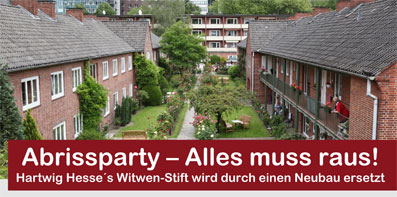 Die Hartwig-Hesse-Stiftung lädt am Freitag, den 1. April 2016 in die Alexanderstraße in Hamburg St. Georg ein. Es fällt der Startschuss für den Neubau des Hartwig-Hesse-Quartiers und gleichzeitig wird der Abschied von den alten Gebäuden, die in den 1950er Jahren als Witwenstift gebaut wurden, begannen. Senatorin Cornelia Prüfer-Storcks hält aus diesem Anlass eine Rede zum Thema "Weiterentwicklung des Seniorenwohnens". Im Anschluss werden ehemalige Stifts-Bewohnerinnen symbolisch den Abriss einleiten. Alles muss raus! Ab 15 Uhr werden